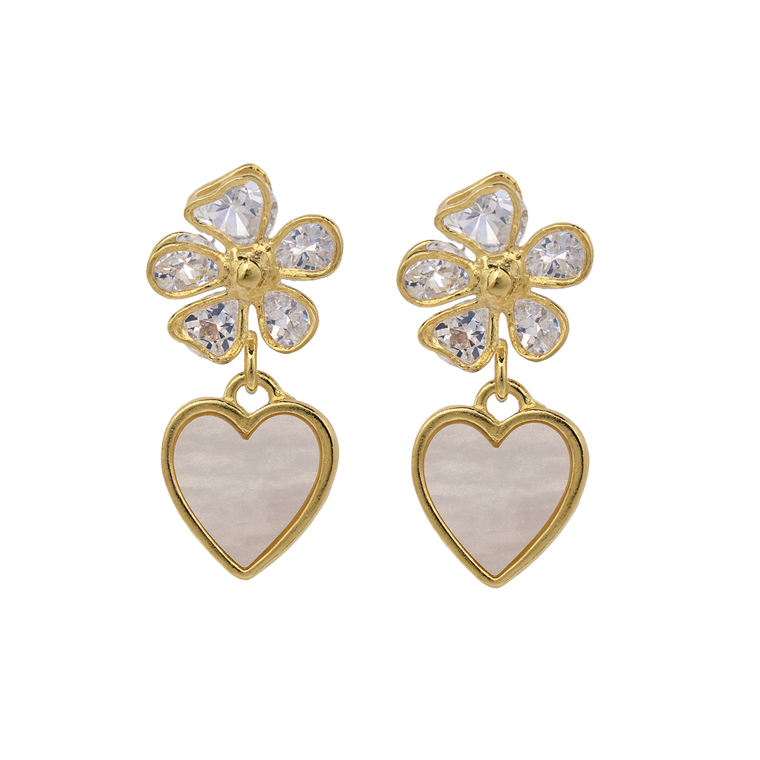 Delicate gold-tone drop earrings featuring a crystal floral stud and a soft heart-shaped charm for a romantic, feminine look.