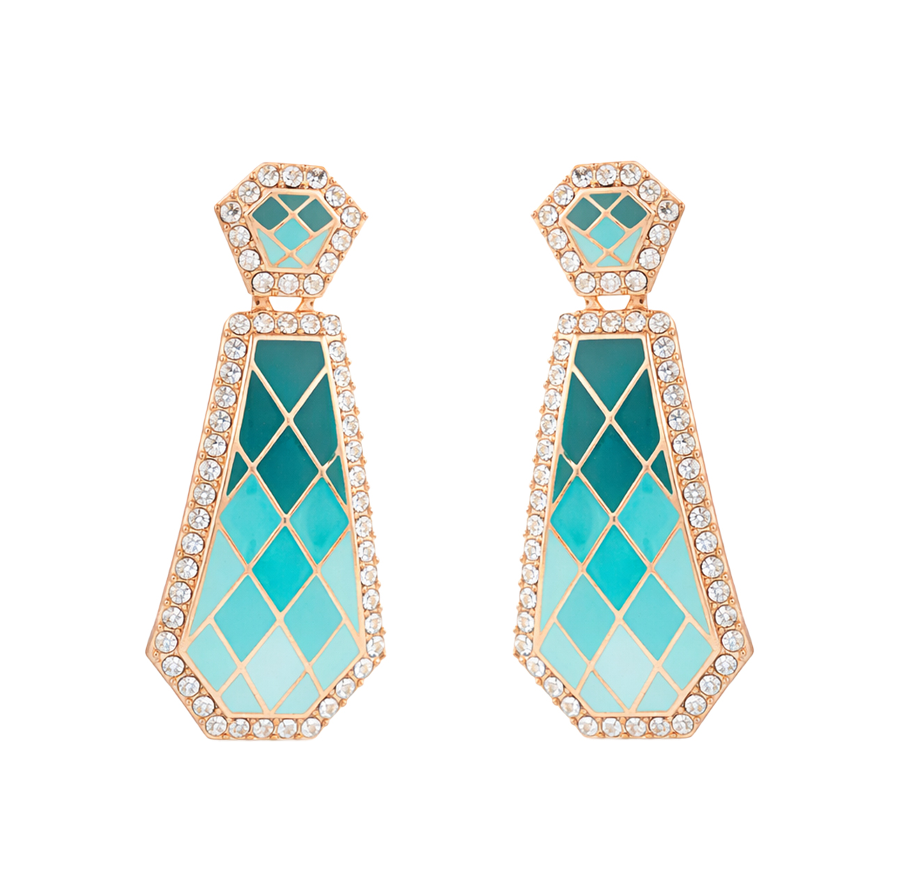 Stunning rose gold geometric drop earrings featuring a captivating aqua-to-teal ombré enamel design framed with shimmering stones. A refined blend of modern glamour and coastal elegance.