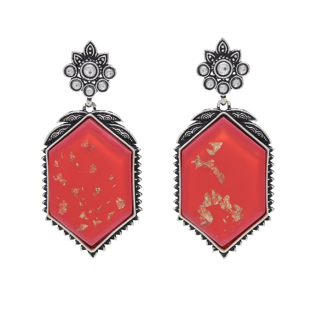 Striking oxidized silver earrings featuring a bold red hexagon stone with antique detailing for a powerful ethnic look.