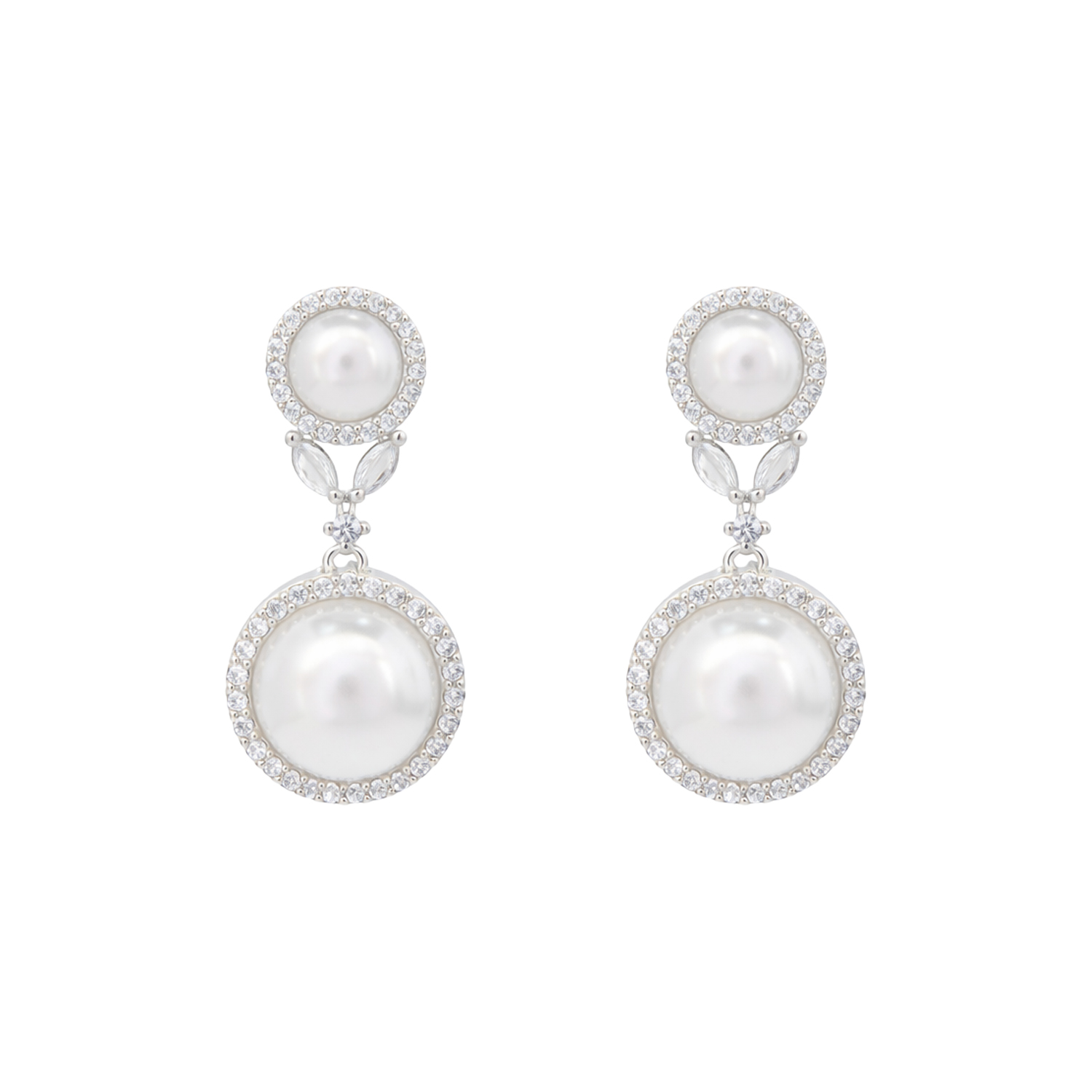 Classic silver-tone drop earrings featuring luminous pearls framed with sparkling crystal accents for a timeless, elegant look.