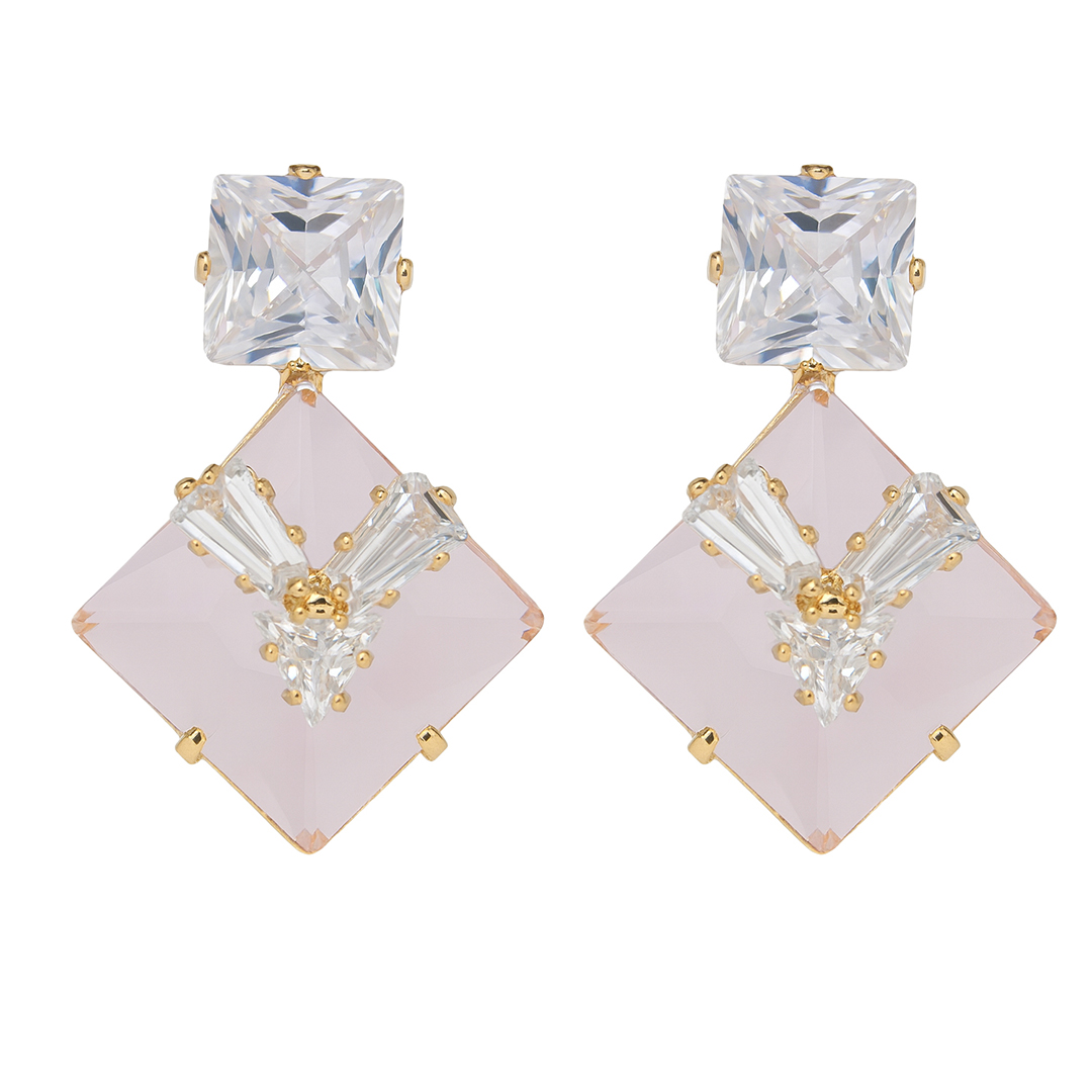 Elegant gold-tone drop earrings featuring soft pink geometric stones accented with sparkling clear crystals for a graceful, modern look.